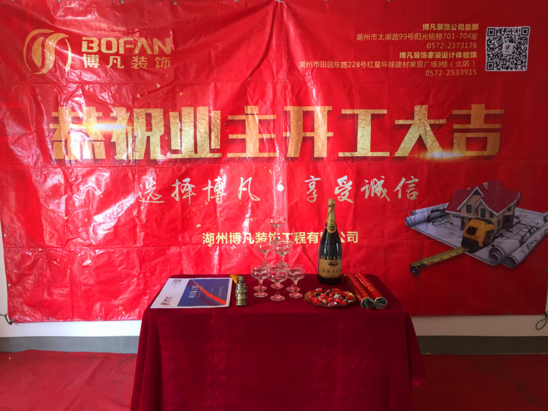 仪式现场,喜庆的礼炮、醒目的开工条幅、香槟美酒,每一处细节都体现出博凡装饰对客户的周到与贴心,也更多的体现出博凡装饰对客户高度负责的服务意识和品牌理念。
