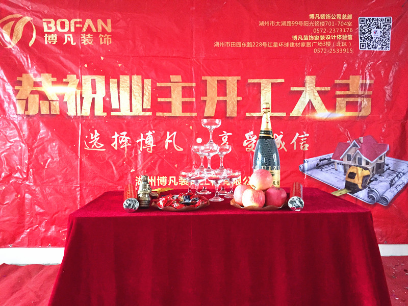 仪式现场,喜庆的礼炮、醒目的开工条幅、香槟美酒,每一处细节都体现出博凡装饰对客户的周到与贴心,也更多的体现出博凡装饰对客户高度负责的服务意识和品牌理念。